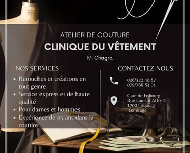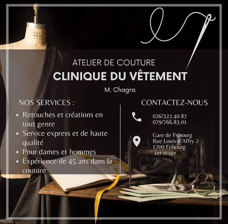 Une entreprise de couture de renom à Fribourg, offrant des services de retouches et créations de vêtements de haute qualité depuis plus de 45 ans.
